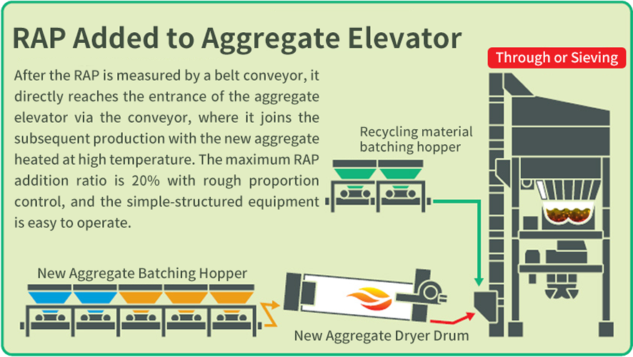 หลังจากดึง RAP ออกจากถังผสมแล้ว RAP จะเข้าสู่ถังบัฟเฟอร์ RAP เฉพาะผ่านสายพานลําเลียงและลิฟต์ มีถังชั่งน้ําหนักพิเศษที่ด้านล่างของถังบัฟเฟอร์ RAP ที่จําเป็นสําหรับแต่ละรอบการผสมจะถูกส่งไปยังเครื่องผสมโดยตรงหลังจากการชั่งน้ําหนัก RAP ส่วนใหญ่ดูดซับความร้อนของมวลรวมใหม่ในกระบวนการผสมเพื่อให้ได้อุณหภูมิที่จําเป็นสําหรับการผลิตความสามารถในการทําความร้อนต่ํา วิทยุเพิ่ม RAP ผันผวนตั้งแต่ 15%-40% การไล่ระดับของส่วนผสมได้รับการควบคุมอย่างแม่นยําในระหว่างการผลิตนําผลิตภัณฑ์สําเร็จรูประดับพรีเมียม